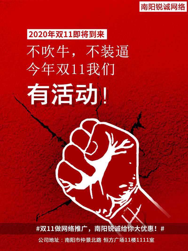 既然淘寶有雙十一,天貓有雙十一,那怎能少得了銳誠網(wǎng)絡推廣呢,這次雙十一經(jīng)討論,南陽銳誠也開展了一場優(yōu)惠活動,只要從十月份截止到11月11日24:00前參加網(wǎng)絡推廣優(yōu)化的客戶,不僅會送競價預存大禮包,百度、360、搜狗、愛采購均可使用!
